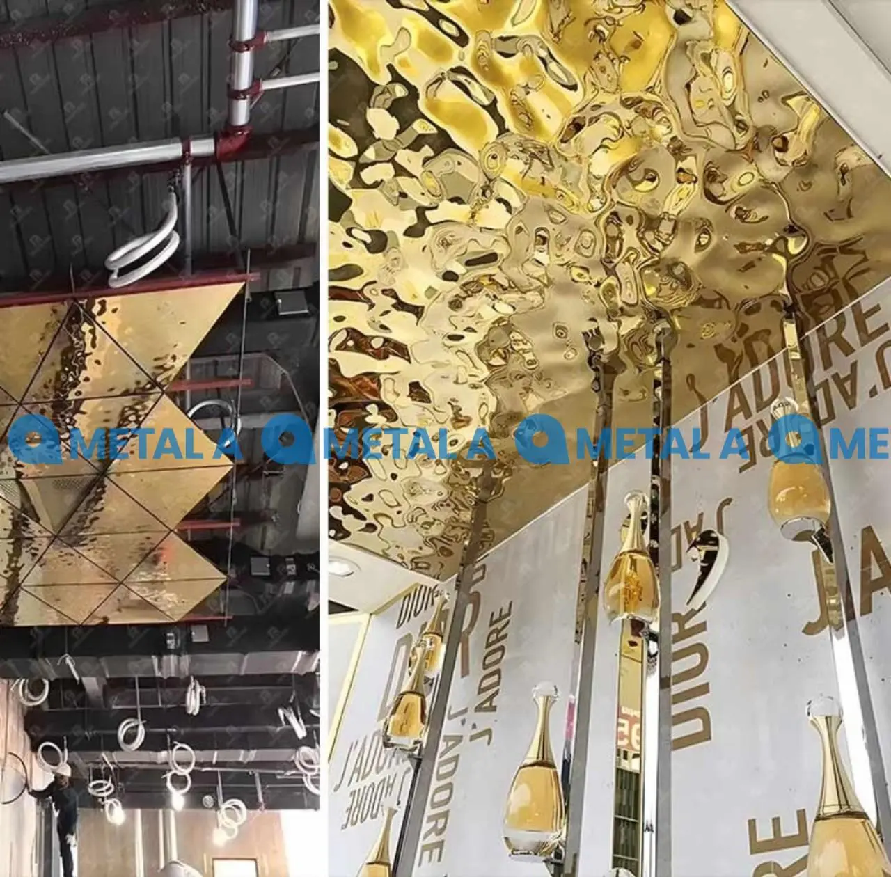 Tấm trang trí inox sang trọng - Tấm sóng nước mạ PVD vàng trên nền gương Tạo vẻ tinh tế và sang trọng cho không gian của bạn với các tấm trang trí bằng thép không gỉ tuyệt đẹp của chúng tôi. Thiết kế gợn nước độc đáo này tạo thêm điểm nhấn trang nhã cho bất kỳ trần nhà nào, khiến nó trở thành sự lựa chọn hoàn hảo cho chủ đầu tư. Tấm trang trí của chúng tôi được làm từ thép không gỉ chất lượng cao, đảm bảo độ bền và tuổi thọ cao. Thiết kế gợn nước tạo ra hiệu ứng hình ảnh mê hoặc, tăng thêm chiều sâu và kích thước cho trần nhà. Cho dù bạn muốn nâng cao bầu không khí của sảnh khách sạn, nhà hàng hay nhà ở, tấm trang trí của chúng tôi là sự lựa chọn hoàn hảo